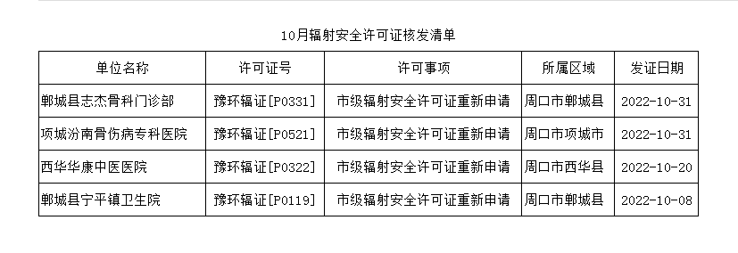 2022年10月辐射安全许可证核发清单